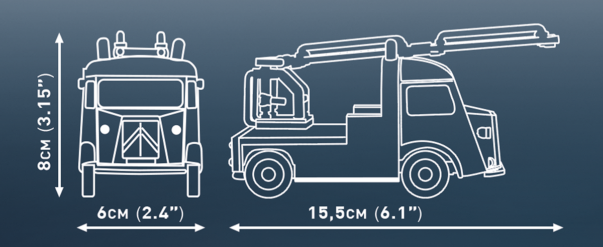 210 präzise Bausteine – das Set besteht aus sorgfältig gestalteten Elementen, die die einzigartige Silhouette des Citroën Typ H, seine Feuerwehrausrüstung und den robusten, funktionalen Charakter des Einsatzfahrzeugs widerspiegeln.