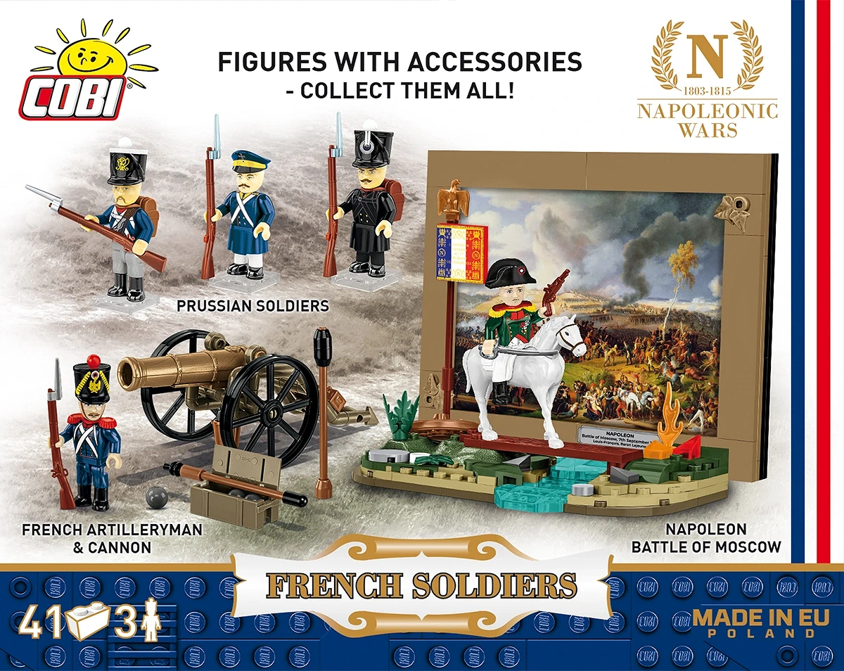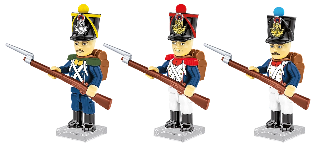 Neue Elemente – Für die Kollektion „Napoleonische Kriege“ wurden komplett neue Zubehörsets entwickelt, die den Gegebenheiten der Napoleonischen Ära entsprechen. Neue Tschakos, Schulterstücke, Rucksäcke, Gewehre mit Bajonetten, Pompons und einzigartige, langlebige Drucke erwarten Sie. Für jeden Geschichtsbegeisterten – dieses Set eignet sich sowohl zum Spielen als auch zum Ausstellen. Ideal für Kinder ab 5 Jahren und erwachsene Sammler, die Dioramen der Napoleonischen Kriege für ihre Sammlung bauen möchten.