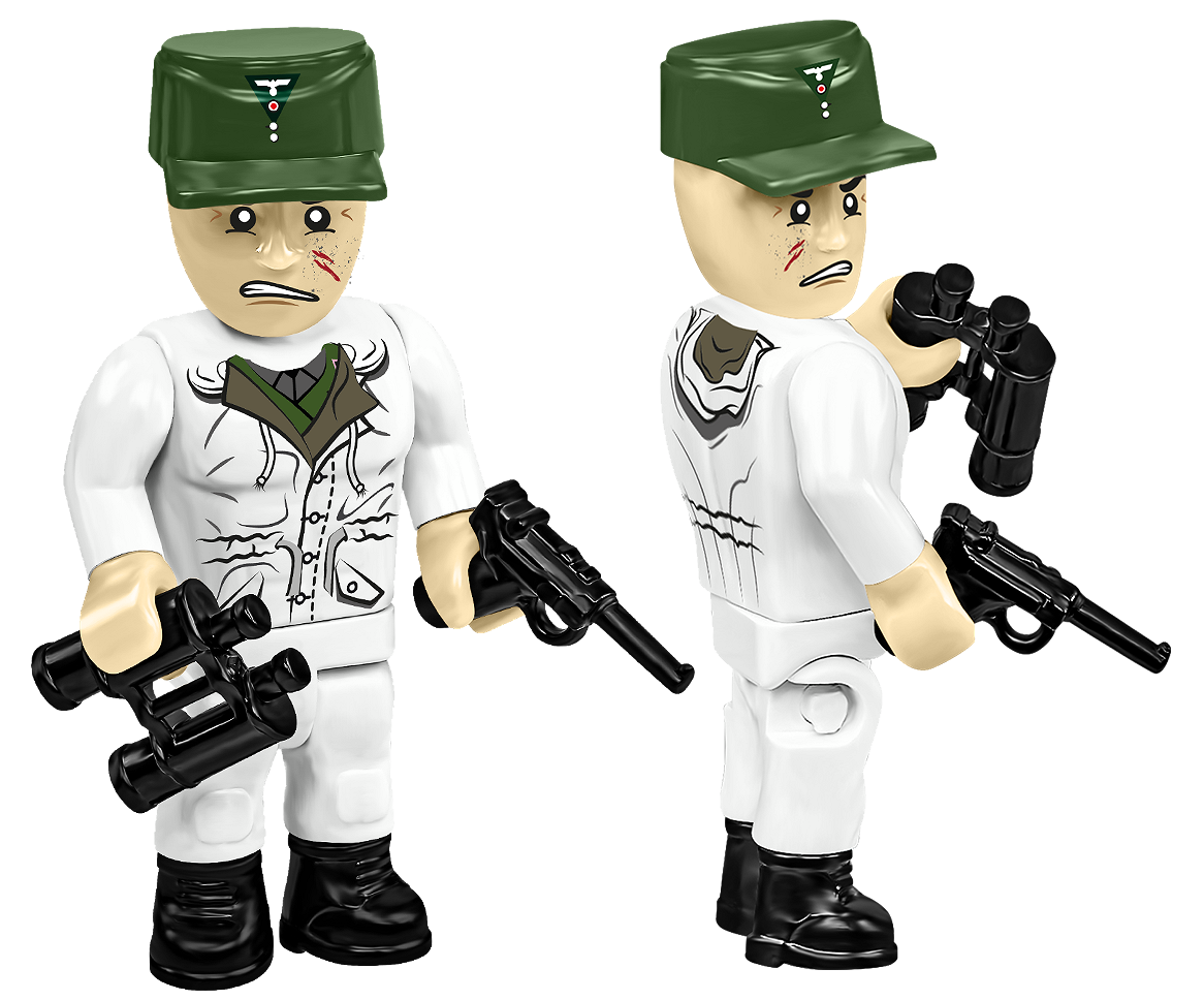 • Panzerkommandant – eine Figur eines Panzerbesatzungsmitglieds mit Fernglas, Feldmütze und weißem Tarnoverall. Exklusive Figur, nur in diesem Set erhältlich!