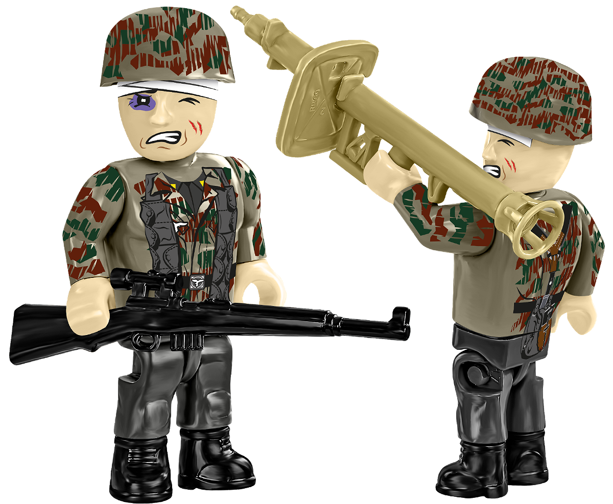 • Ein deutscher Fallschirmjäger – in Uniformjacke und Tarnhelm. Seine Bewaffnung umfasst ein Gewehr 43 und einen Panzerschreck.