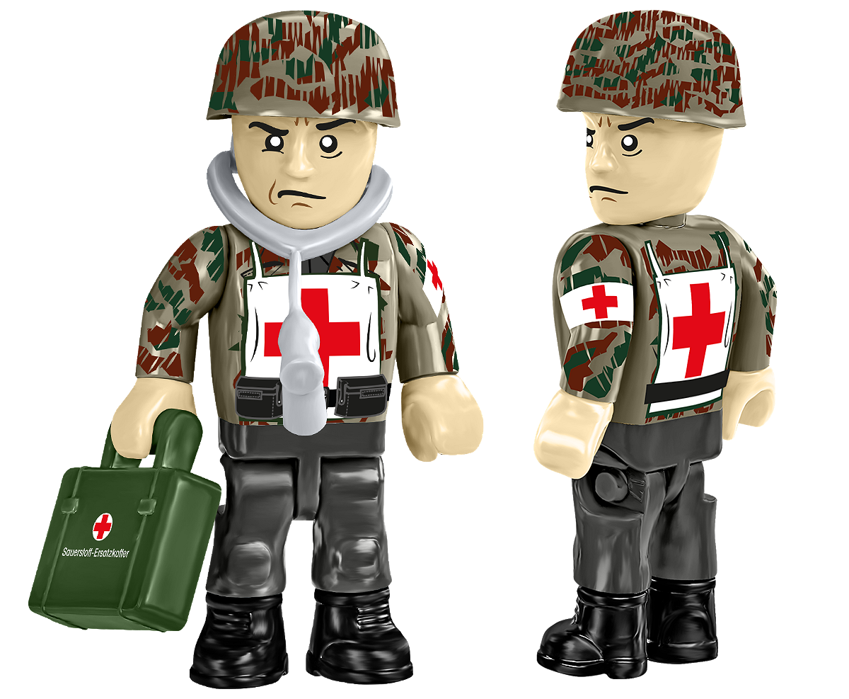 • Ein Sanitäter (Fallschirmjäger) – mit Tarnhelm und Uniform mit Rotkreuzabzeichen. Er verfügt über einen Erste-Hilfe-Kasten, eine Trage und ein Stethoskop.