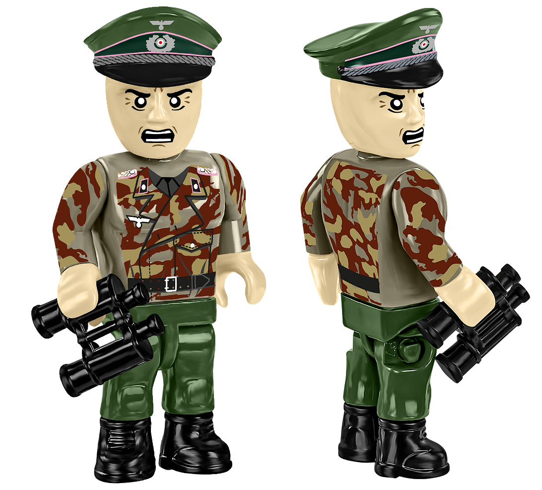 • Kommandant – Bekleidet mit grüner Hose und Tarnuniform. Er trägt eine Offiziersmütze und hält ein Fernglas.