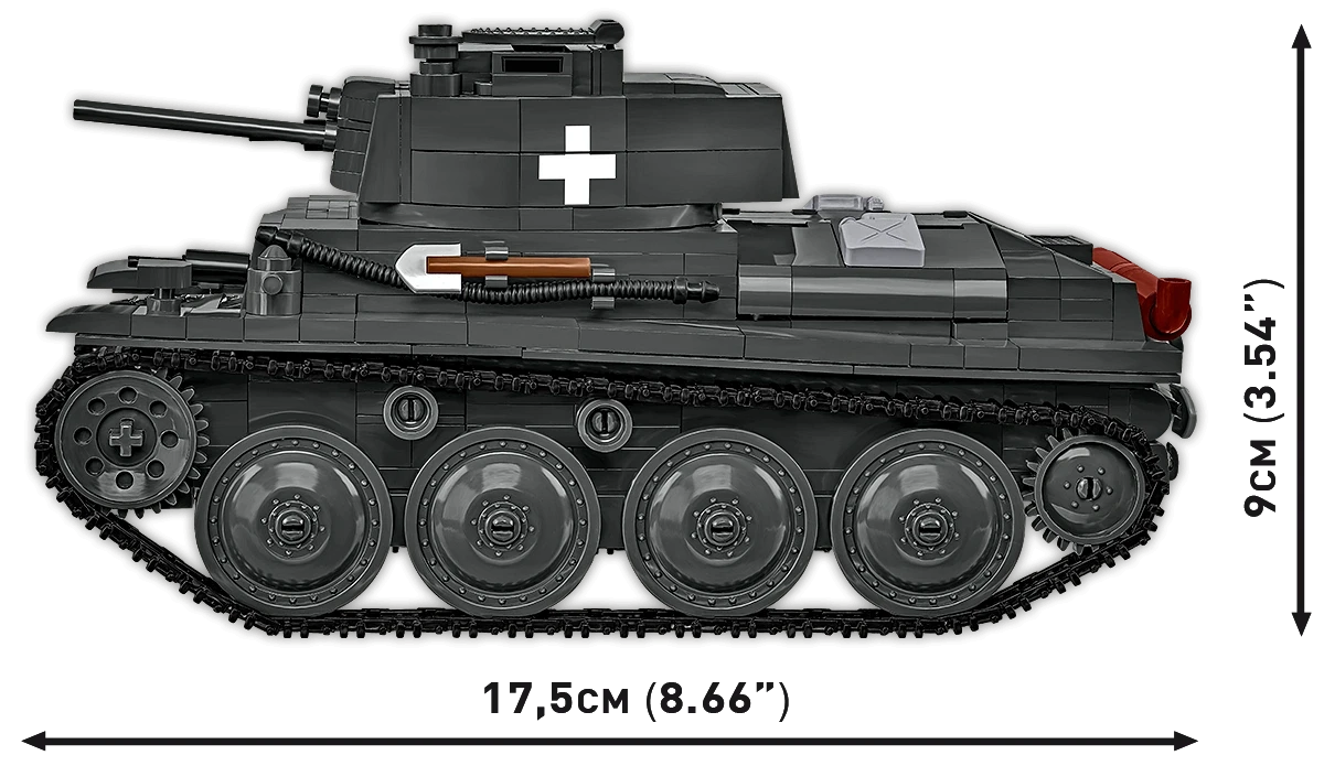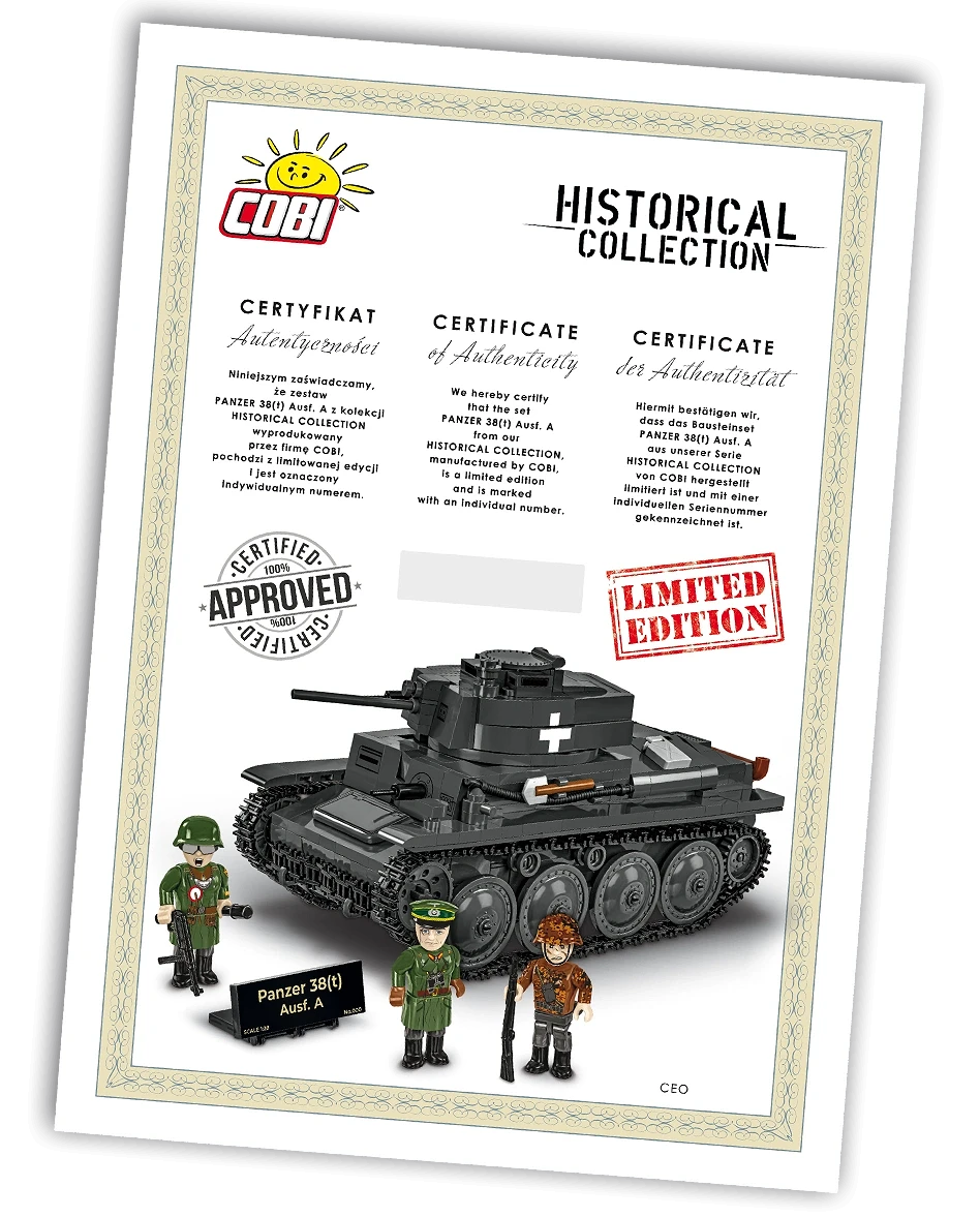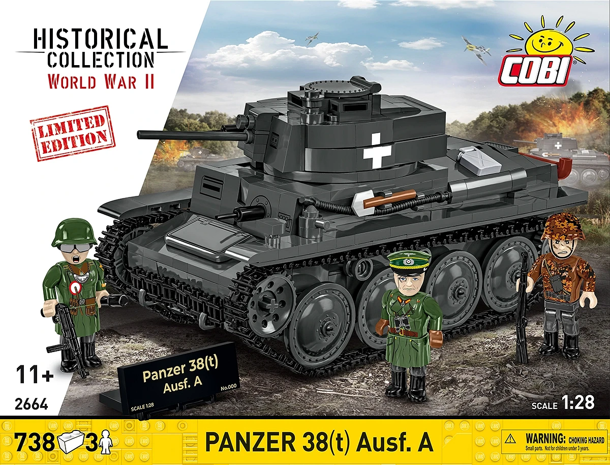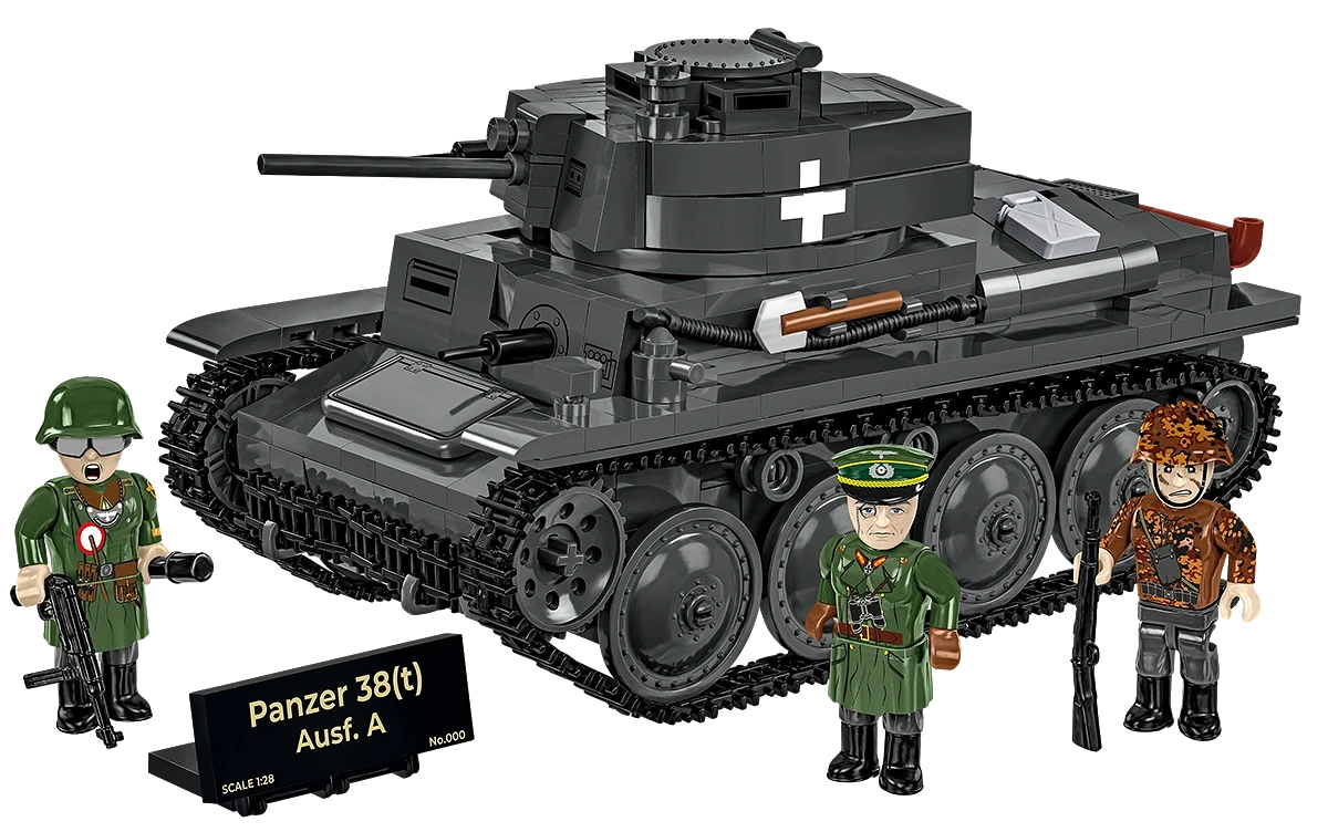 Nach der Annexion der Tschechoslowakei übernahmen die Deutschen das LT vz. 38 Projekt und begannen die Produktion des Panzerkampfwagens 38(t) in den BMM-Werken. Die Ausführung A Version von 1939, die als COBI-Modell nachgebildet wurde, nahm an den September- und Frankreichfeldzügen teil. Zu den einzigartigen Konstruktionsmerkmalen gehörten: eine für einen leichten Panzer leistungsstarke 3,7-cm-Kanone und eine genietete Panzerung. Diese Bewaffnung war der des deutschen leichten Panzers überlegen, und die 25 mm starke Frontpanzerung war nur geringfügig schwächer als die der Panzerkampfwagen III und IV.