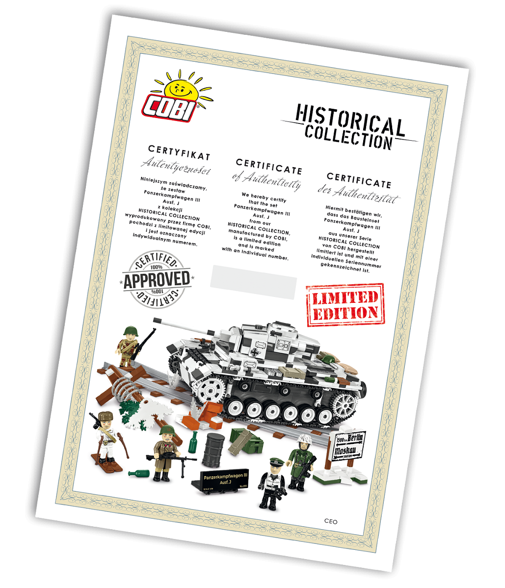 • Echtheitszertifikat – ein nummeriertes Dokument, unterzeichnet vom CEO von COBI.