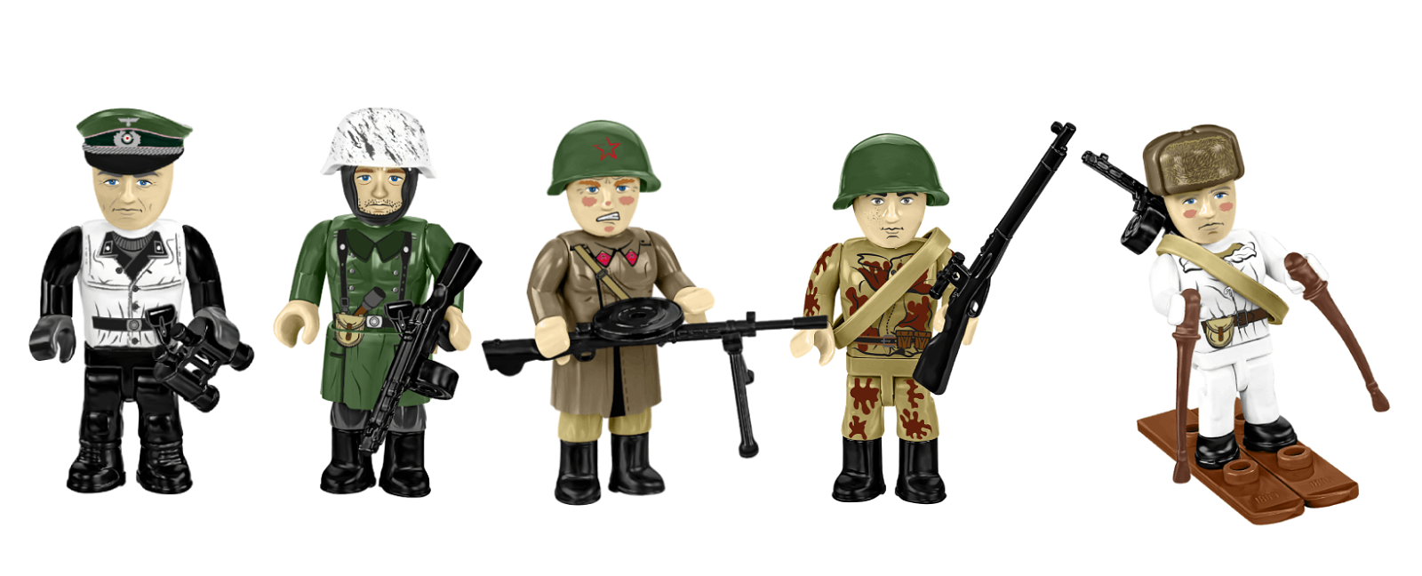 • Sowjetischer Infanterist – mit Wintermantel und Helm Modell 40, bewaffnet mit einem DP-27-Maschinengewehr mit Tellermagazin.