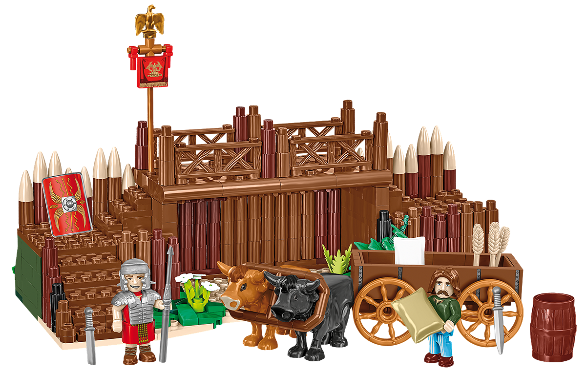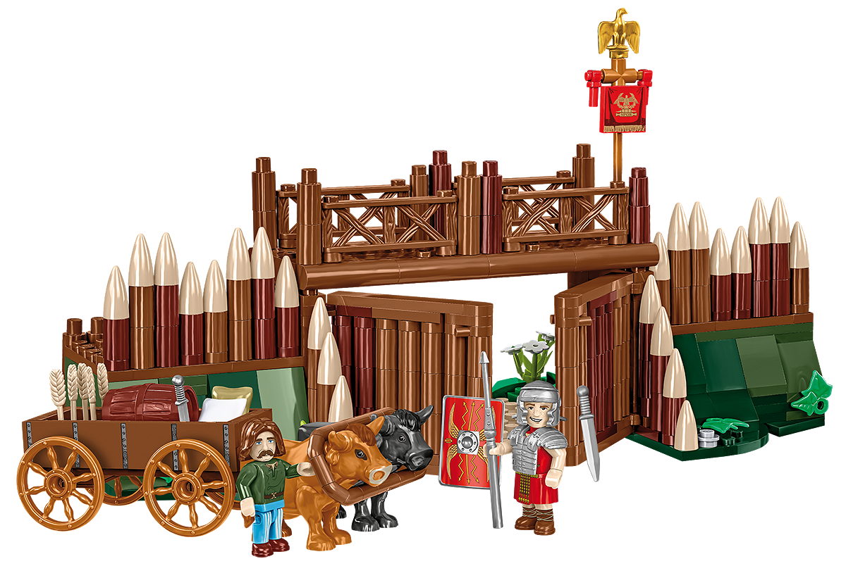 Set mit umfangreichem Zubehör – Ein Wagen mit Gütern, ein realistisches Tor, Ochsen, eine Legionsstandarte und detailreiche Figuren schaffen eine stimmige, stimmungsvolle Szene – perfekt zum Spielen, Sammeln oder Erweitern größerer Bauwerke.